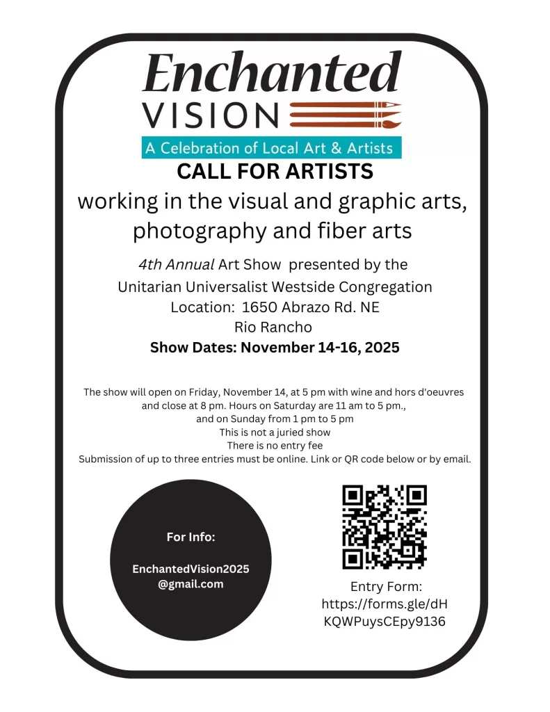 - We’re looking for artists for the 4th Annual Enchanted Vision Art Show in November and we need your help spreading the word. As always, entries in this show must be in the visual and graphic arts, photography and fiber arts. Essentially, the pieces must be hangable on a wall. The show does not include jewelry, pottery, sculpture or other crafts. Do you know artists who would like to enter? We are attaching a Call for Artists 2025_pdf that you can share, as well as a jpg photo that you can post to your social media. We will also have some flyers printed out for you to pick up on Sunday. Would you help get out the word? Click on the attachments below for more info and a flyer.