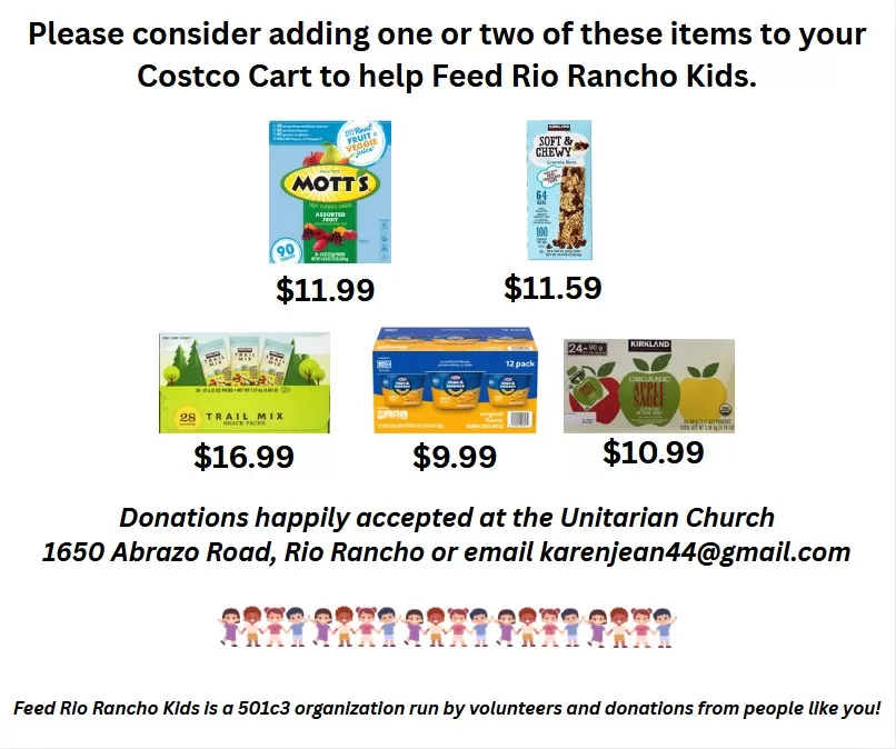 *The Unitarian Universalist Westside Congregation provides space for storage of the food and for assembling the packets. Feed Rio Rancho Kids is led by volunteers. All funds donated go for the purchase of the contents of the packets.
